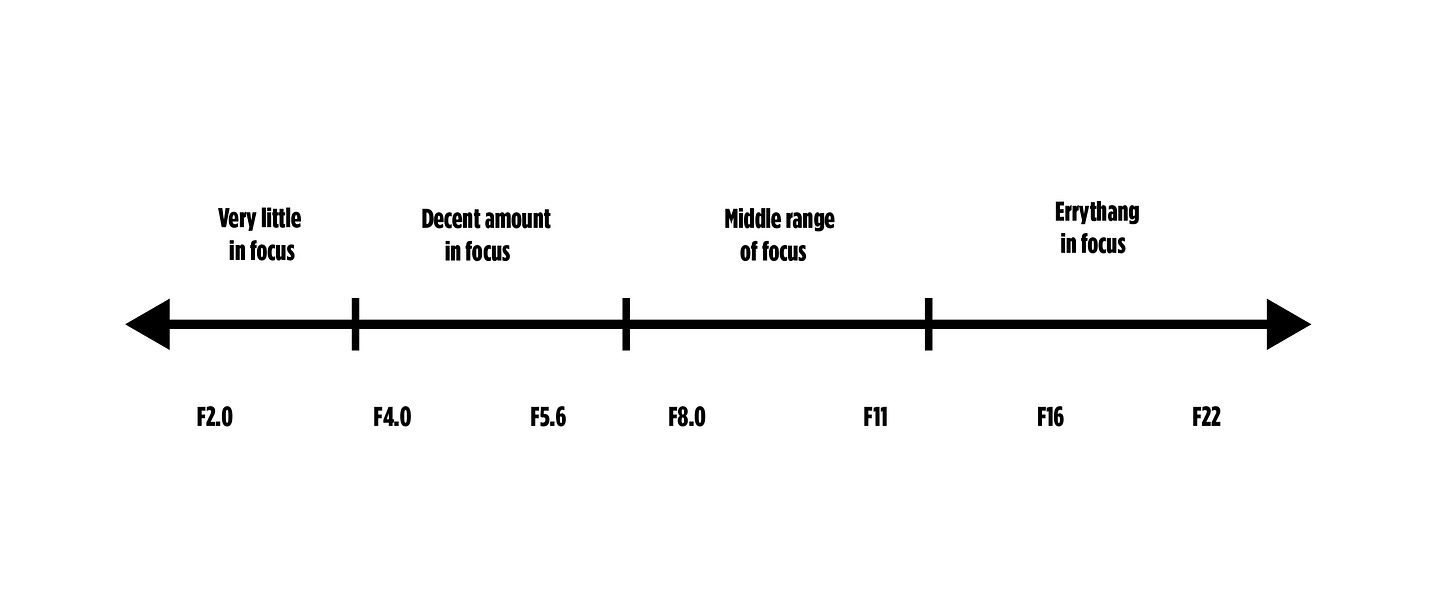 This is the part where I could talk about how there is a little circle inside of a bigger circle in your camera lens, and how it opens like an asshole to let more light in. But that sh*t doesn’t really matter—pun intended. All you need to know about aperture is its a set of numbers starting low and going higher that tells you how much of the photo is in focus. That’s it. If you want to use fancy photographer terms it’s “depth of field”.